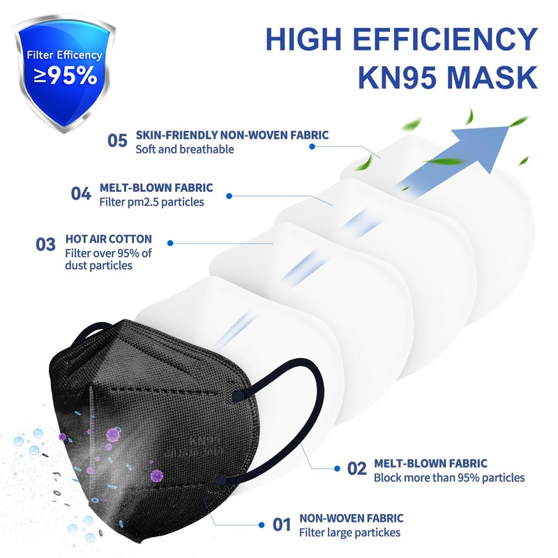 Stay protected in any situation with FACEMOON's KN95 Face Masks for adults. These black masks are not only stylish but are also designed to provide the ultimate protection. Each pack contains 100 masks, individually sealed for freshness and cleanliness. Every mask is composed of five layers of material, including two layers of non-woven fabric, two layers of melt-blown filters, and a middle layer of non-woven cotton. This combination ensures superior filtration while maintaining breathability.