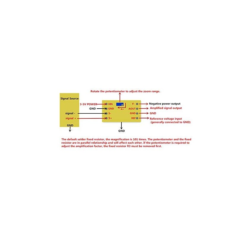 The default magnification is 101 times with R3 resistor. If welding potentiometer, it will be adjustable, Aout=(1+100K/RG)VIN. Please remove R3 resistor when welding potentiometer.
