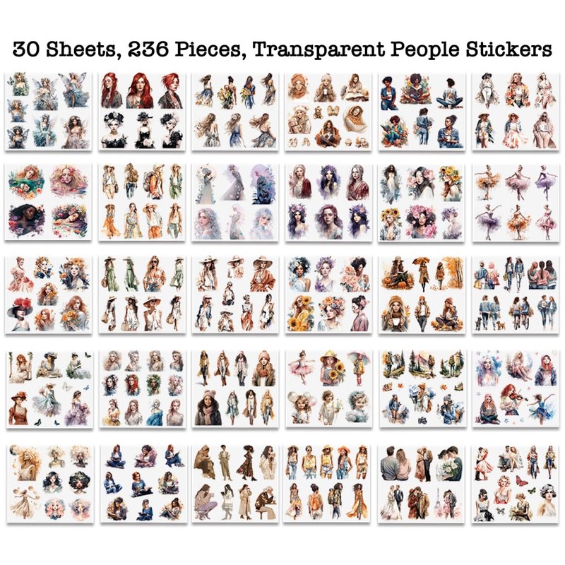 - RICH DIVERSITY - Each package includes 236 unique character stickers across 30 different sheets, featuring a variety of colors and themes. Our character girl stickers celebrate diversity with a wide range of skin tones and themes, including reading girl, celestial goddess, flower girl, fashion girl, princess fantasy, romantic couple, Victorian vintage lady, back view girl, curvy girl, hiking girl, summer vacation girl, garden fairy...