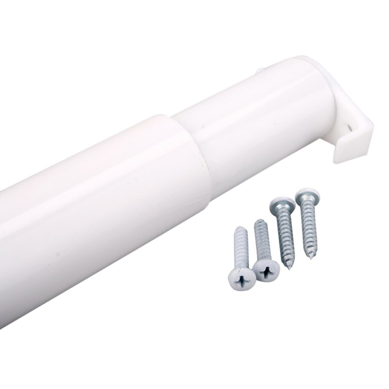 Telescoping Tubes Fits Any Size Opening. Fast, Simple Installation. No Cutting Or Fitting Required. Hook Flange Insures Proper And Accurate Fit. 1" Seamless Tubing, Brite-Plated. Ample Overlap Insures Greater Strength. White. Length: 72"- 100".