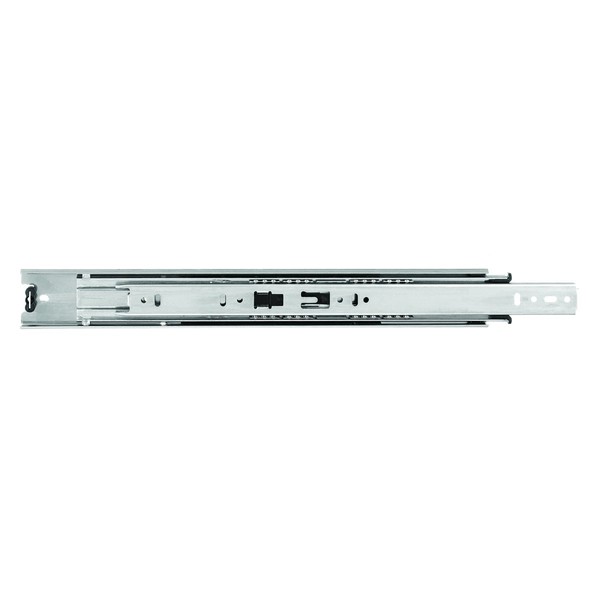 100 lb. class full extension drawer slide features an ergonomically designed push-in lever release for easy drawer removal. The reversed flex tabs allow improved slide performance with side clearance tolerance adjustments. 8400 is an unhanded design with traditional and 32mm hole patterns that supports industry standards. Designed for use on box or file drawer applications up to 24-inches wide