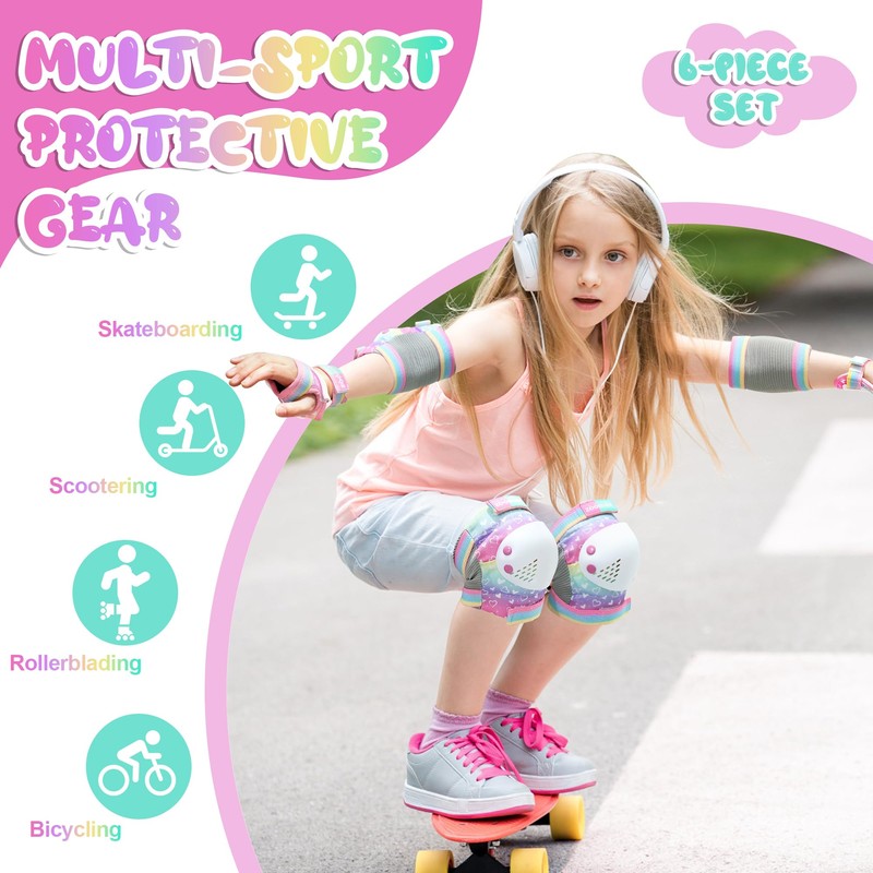 Knee Pads for Kids, ZOOBLISS Toddler Knee and Elbow Pads Set Wrist Guards for Skating Girls Aged 3-15, Kids Protective Gear for Roller Skates Skateboard Bike Scooter, Included Drawstring Bag (Rainbow)