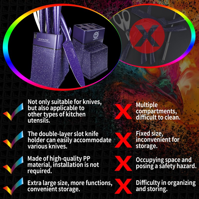 - Universal Knife Holder: This knife holder design to feature angled slots with wider openings to allow for easier handling and storage of knives. It is ideal for paring knives, steak knives, chef knives, utility knives, and etc.