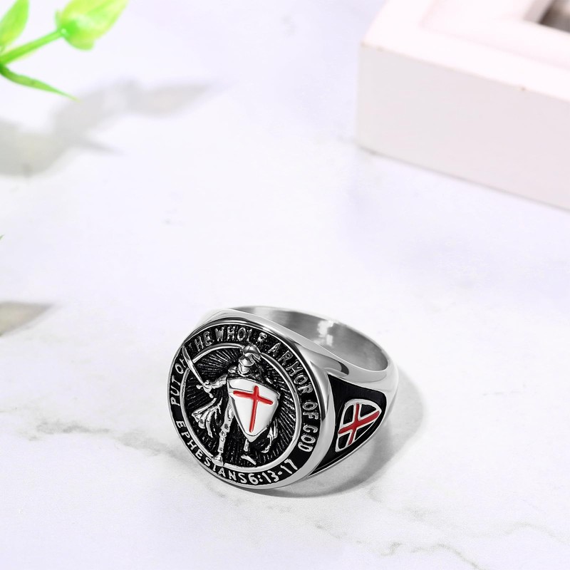 Knight Templar Cross Ring for Men: Stainless Steel Put On The Whole Armor of God Red Cross Amulet Signet Rings Band Jewelry Gifts, Size 8-13, Metal, No Gemstone