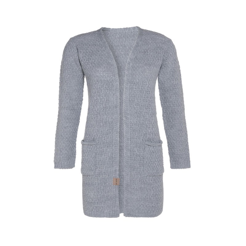 The material composition is made of wool and polyacrylic, which makes the cardigan soft and warm. This mid-length cardigan from the Knit Factory Luna collection has a loose fit with an open front and long sleeves. The robust Knit Factory label with decorative nest ring and additional accessories ensures a striking detail. This cardigan can be worn all day long. Colour: grey. Size: 36/38.