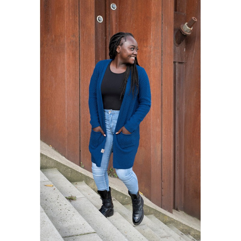 - This mid-length cardigan from the Knit Factory Luna collection has a loose fit with open front and long sleeves