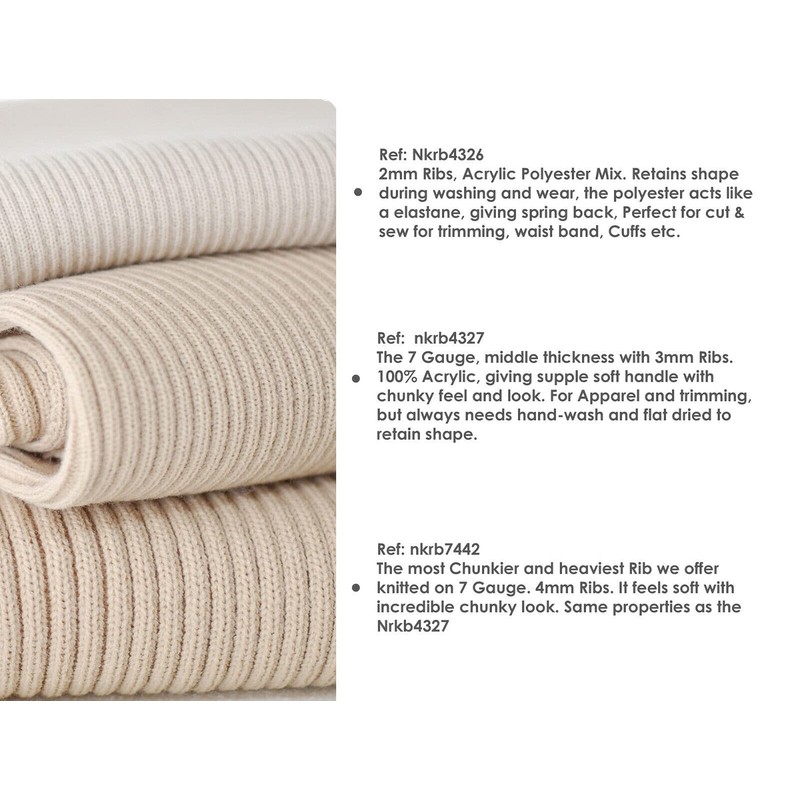 - The other two ribs on offer (nkrb4327 and nkrb7442) are 100% Acrylic, and are more CHUNKIER – see the comparison pictures. They are softer in feel as they are 100% Acrylic, but less resilient than the one with Polyester mix. The use of each is for buyers to see its use, function, handle and look. We suggest you buy sample of each