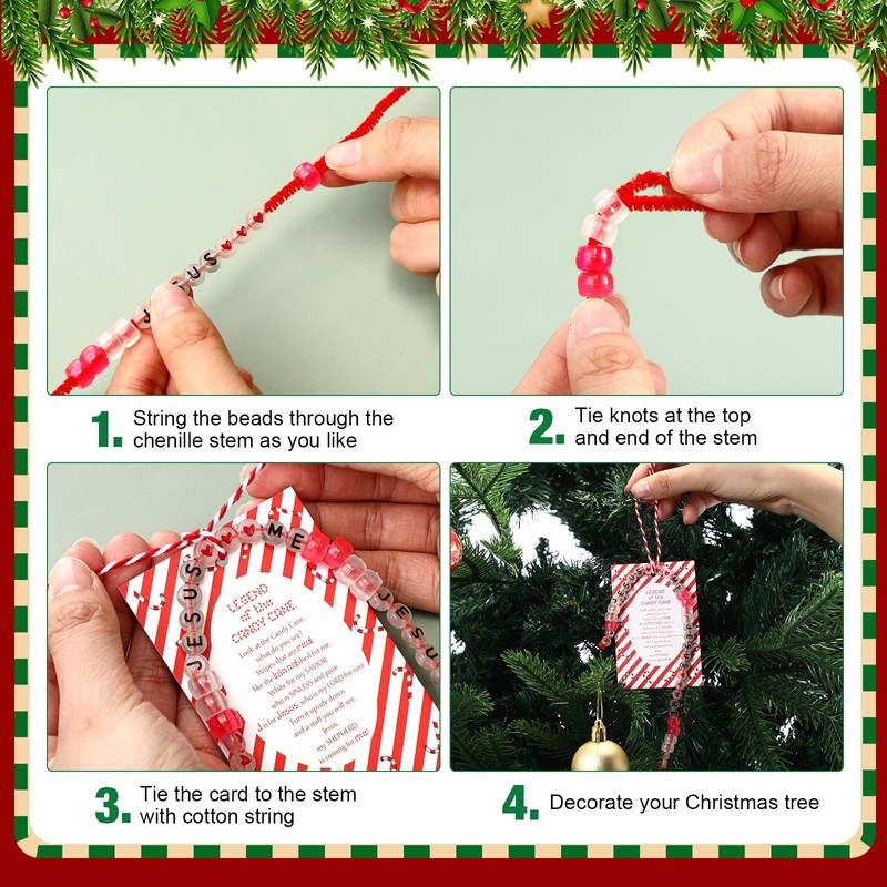 - Makes 12 Craft Kits: this candy cane ornament craft package contains 384 luminous beads, 12 candy cane story cards, 5 meter long red and white cotton rope and 12 chenille stems; The 384 luminous beads are 150 white beads, 100 red beads, 84 letter beads and 50 white flat beads with hearts printed on them