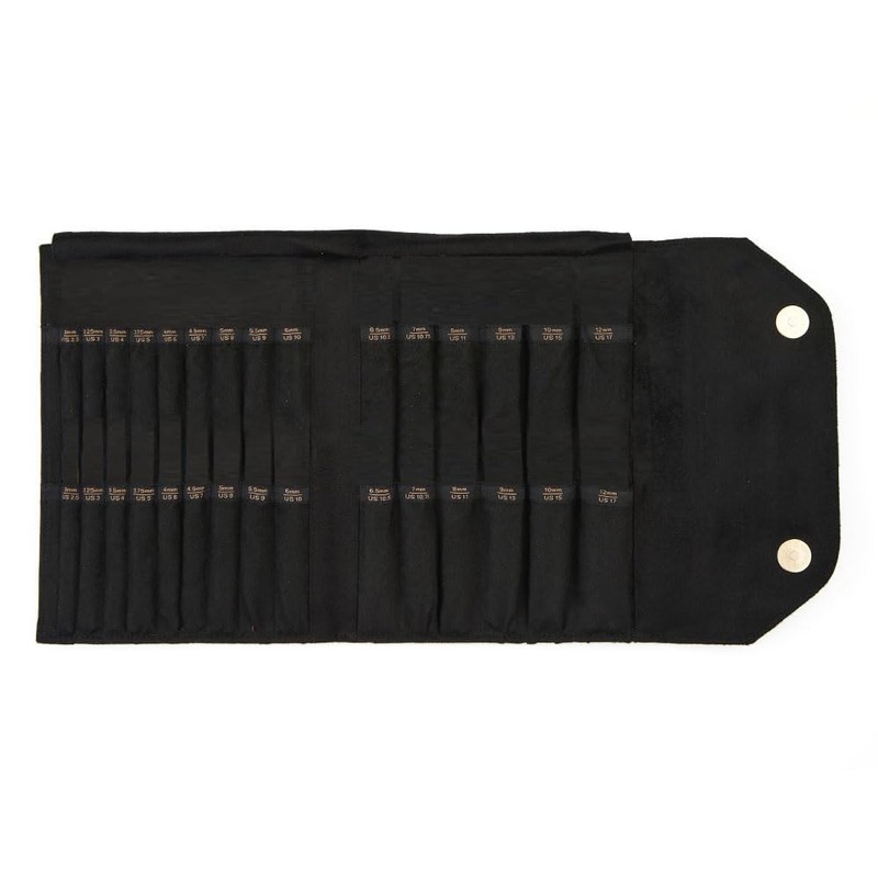 Interchangeable Needle Case – Closed size 22 (W) x 17.5 (H) x 1.5 (D) cm/ 6.9”(W) x 8.5 (H) x 0.5 (D) is smartly sized IC needle case holds 30 pairs of needle tips and interior flaps make sure that none of them slip out. The inside pockets are clearly labelled for needle size, while the zippered pocket, on back, can hold more than one cable. The snap closure keeps contents secure and it folds flat for easy tuck-in to a bag, suitcase or tote. Clay beautiful beige (Clay) or elegant black (Coal), the faux suede cases are supple yet strong. Ideal for travel, they are easy to take on the road or store away at home. Never has organization felt, and looked, so good! Available in two shades -beige and black.