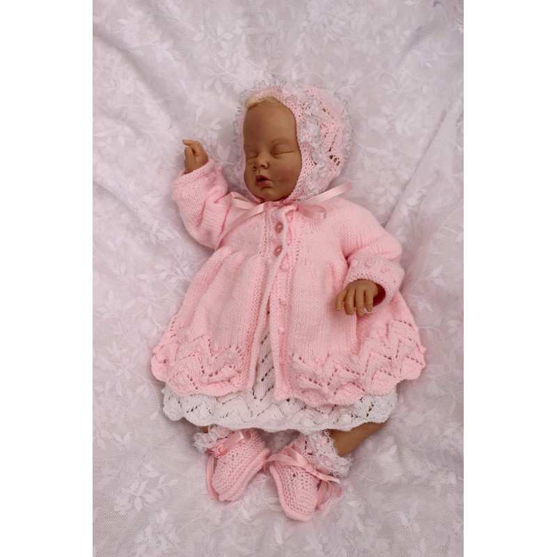 • The delicate pattern trimming the jacket is repeated over the dress skirt and then again on the bootees and bonnet