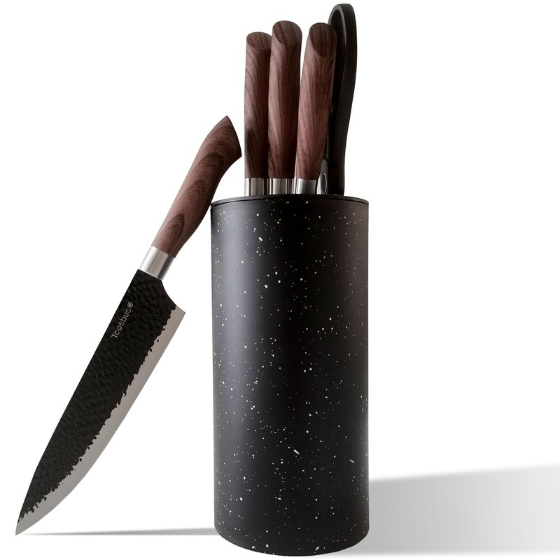 • 【6pc Chef Knife Set】Toosbuc Knife Set includes the knives you need to use, Kitchen Knife,Chef's Knife,Slicing Knife,Utinity Knife,Scissor and Knife Block Holder,Allowing you to have all the knives needed for a kitchen,with a knife bucket,so you don't have to worry about the placement of knives,easily solving the problem of kitchen knife configuration