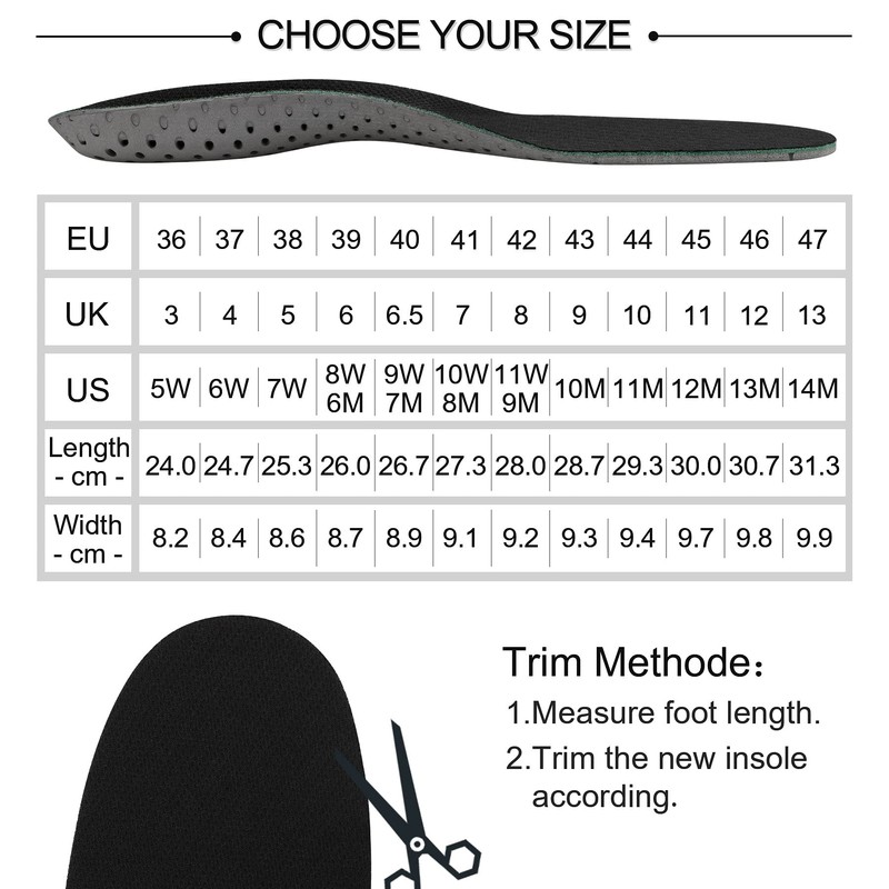 ✩ If your original insoles are shorter than the new insoles, you can trim along the contour on the bottom of the new insoles to match the size of your current insoles.