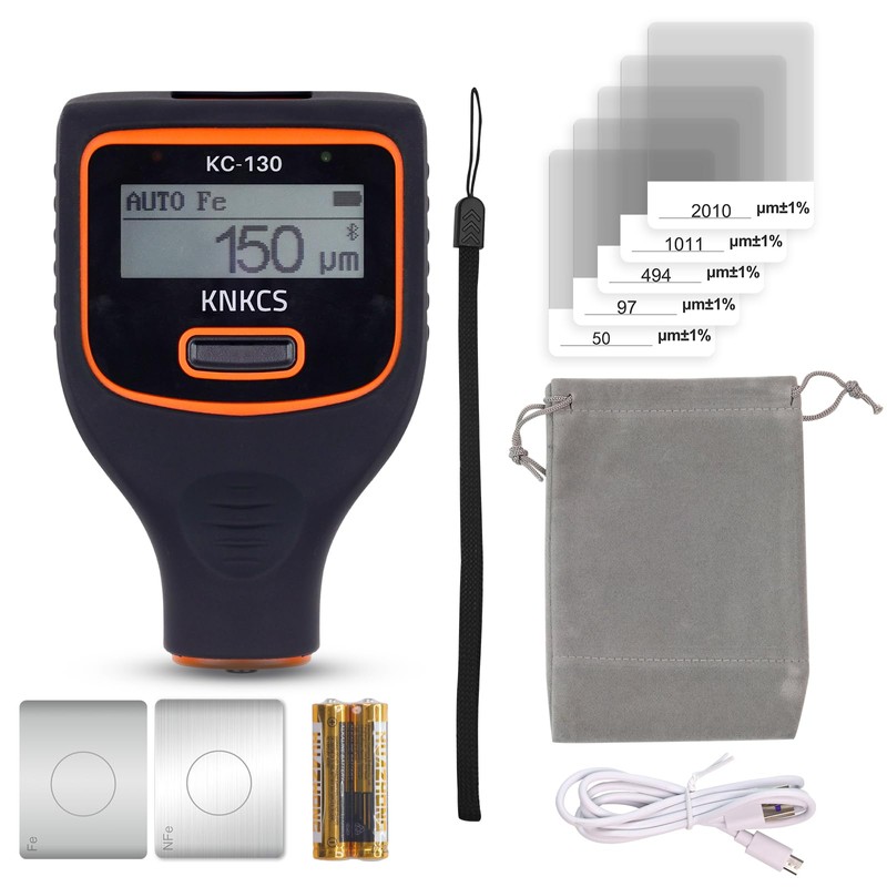 Introducing the KNKCS KC-130, an exceptional tool designed for professionals and enthusiasts who require precise measurement of coating thickness on metals, paints, or industrial surfaces. This state-of-the-art device, also known as an auto lak test pen, is engineered to deliver accuracy and efficiency with every use. Featuring a dual-screen display, the KC-130 provides a large LCD on the front and a smaller OLED on top, ensuring visibility from multiple angles. The KC-130 is equipped with a ruby wear-resistant probe which utilizes magnetic induction and eddy current effects to measure thickness with a remarkable range of 0-3000μm. It guarantees accurate readings within ±(2% reading + 1μm), making it an invaluable tool for car paint inspection and other applications. This coating thickness gauge supports Bluetooth connectivity and mobile APP integration, allowing real-time data transfer and analysis. Additionally, it offers USB support for data transfer and firmware upgrades, ensuring that your device remains up-to-date with the latest technological advancements. The KC-130 features user-friendly and powerful single-button operation, enabling swift and seamless measurement. Simply attach the probe to the surface; as it retracts, the device automatically distinguishes substrate properties and measures coating thickness. It comes with a zero calibration function and displays maximum, minimum, average, and count values, with the ability to check back on 10 measured values. An intelligent device, the KC-130 offers automatic power-off and battery protection for extended use. It also includes iron galvanized identification with a blue backlight prompt and iron powder putty identification with a red backlight alarm, ensuring accurate readings and alerts. Ideal for professionals in car detailing, automotive paint testing, or industrial finish evaluation, the KC-130 is a comprehensive metal thickness gauge, featuring a reaction time of less than 0.5 seconds. Embrace precision and efficiency with the KNKCS KC-130, your ultimate partner in coating thickness measurement.