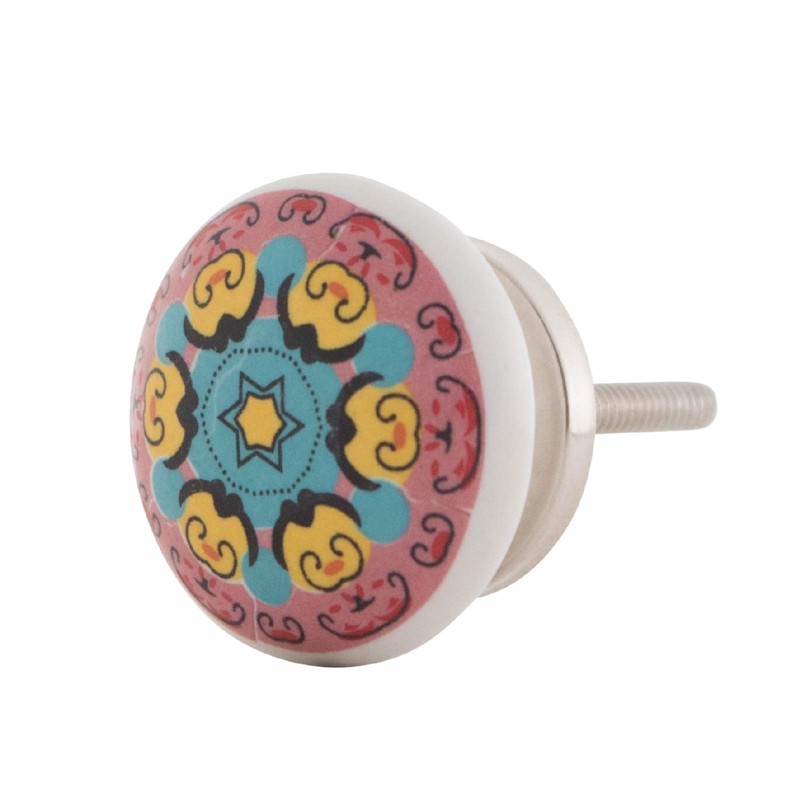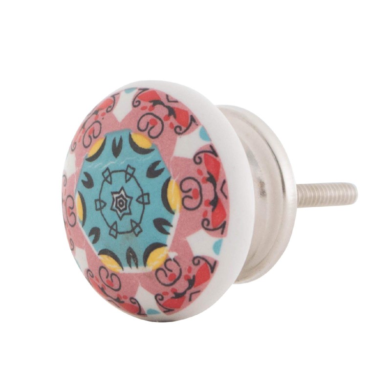 - Set of 10 ceramic furniture knobs printed with mandala patterns.