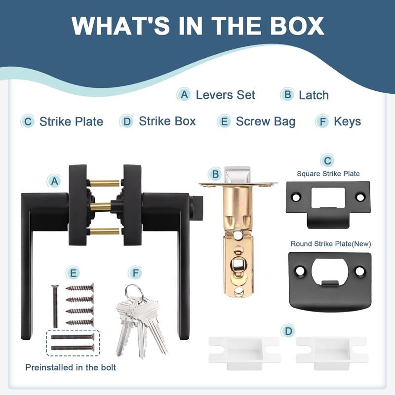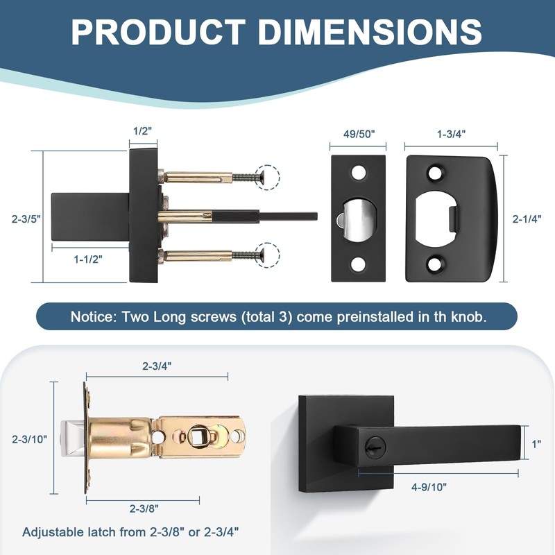 - 【DIMENSIONS】: With an adjustable latch 2-3/8" or 2-3/4"(60mm or 70mm), the door lock fits most standard doors with thickness from 1-3/8" to 1-3/4" (35mm-45mm); lever Length: 4.86" (123mm); rosette diameter: 2.56" (65mm); please note that the latch plate is square and unremovable and 2 long screws are preinstalled in the handle