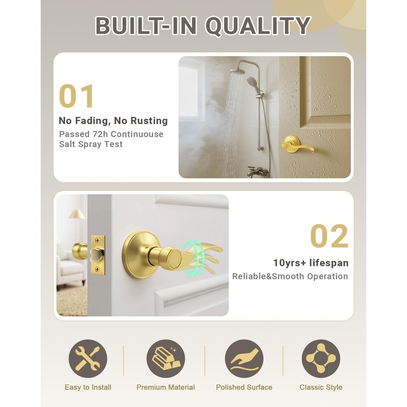- 【PASSAGE DOOR HANDLE】: Designed for high-traffic areas requiring effortless access (closet, hallway, pantry, laundry room), our golden door lever provides keyless operation from both sides for seamless movement. The smooth-action mechanism ensures quiet, frustration-free operation thousands of times daily. Superior durability proven by 72-hour salt spray resistance and 810mm drop-test certification.