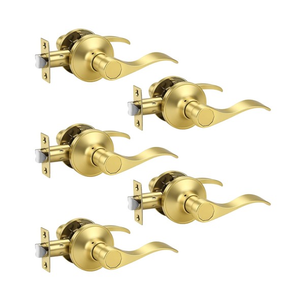 KNOBWELL 5 Pack Brushed Gold Door Lever for Closet Hallway, Wave Style Interior Doorknob Passage Door Handle