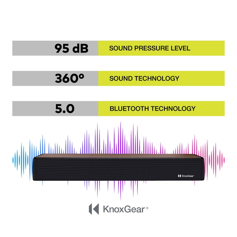 - Features: Enjoy your music, movies, and more to the fullest with the Knox Gear 60-Watt Compact Wireless 2.0-Channel Soundbar with Bluetooth 5.0. A 28-inch soundbar with crystal clear sound, this soundbar comes with an included optical cable. It features DSP technology, has adjustable bass settings, and can be mounted on a wall. And it sports a slick and stylish wood grain finish