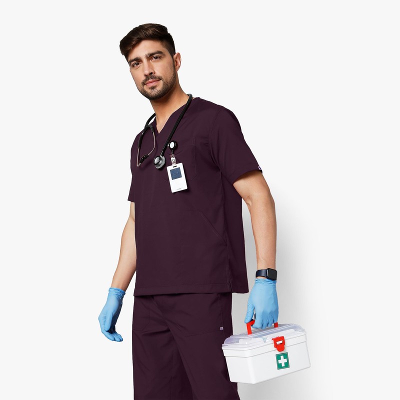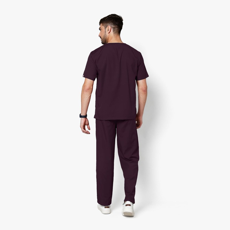 KNYA Active Men's 5-Pocket Scrub Suit | Set of Top & Bottom | Half Sleeves | V Neck | Breathable Fabric | Comfortable | Durable | Uniform for Doctors, Nurses and Dentists, Wine (XS)