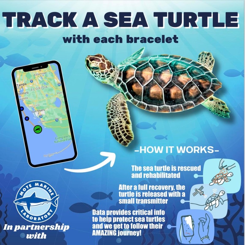 - TRACK: Each bracelet comes with a tracking code that allows you to follow the journey of a real sea turtle on their GPS map!