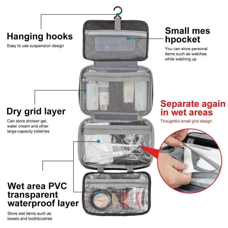 • 【Multifunctional Hanging Design】 Hang securely on any hook (hotel bathrooms, gym lockers, camping tents) with the 360° stainless steel swivel hook. The detachable design allows you to separate the lower compartment as a standalone pouch for day trips or beach outings.