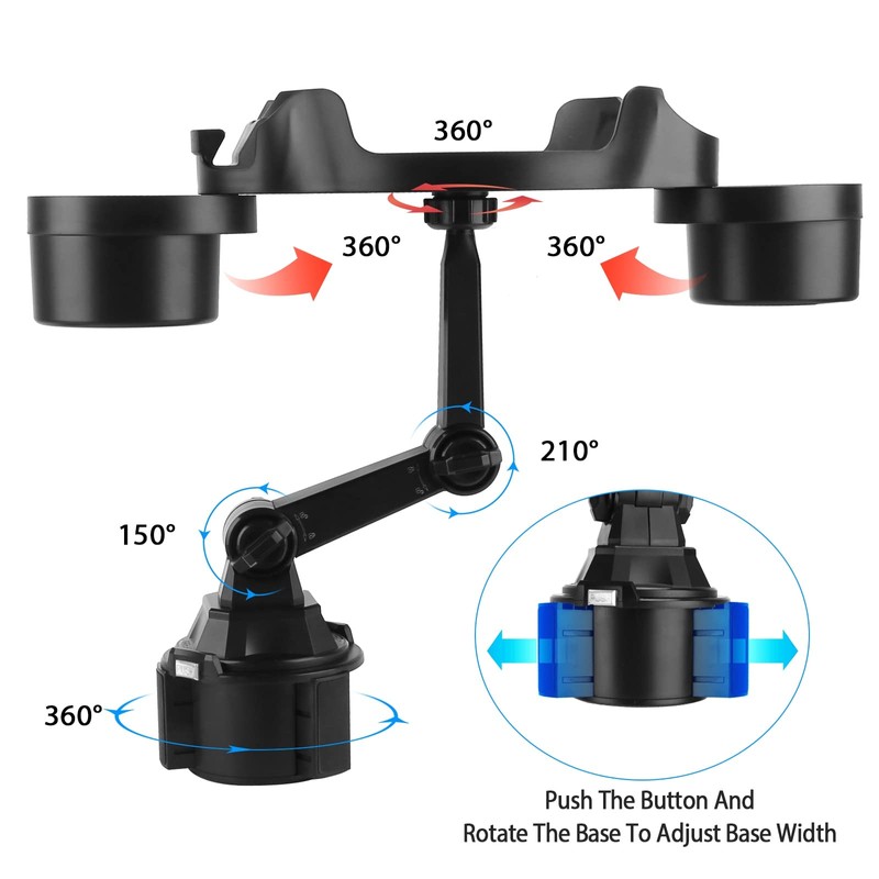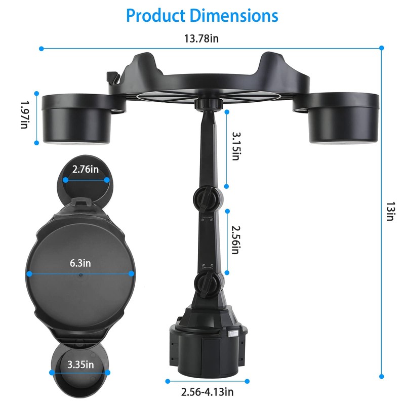 • 【3 In 1 Car Cup Holder Tray】: The car cup holder expander with a 6.3inch round tray and two 360° roatation cup holders are designed together for a combination usage, expanding more space to organize your center console in tidiness. 6.3In Tray can store some small items like keys, coins, bill, phones and even hold your lunch. Two cup holders can hold different bottles with diameter less than 2.76in. With a phone slot, convenient for seeing movies while in lunch time or leisure time.
