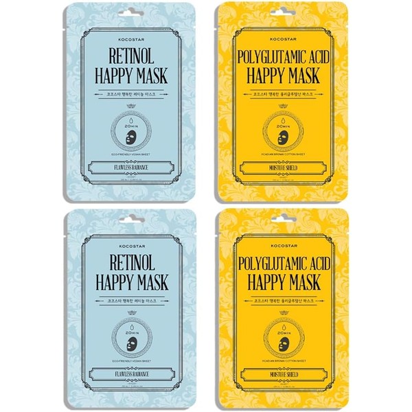 Kocostar I Koreanische Gesichtsmasken: Retinol Happy Mask und Polyglutamic Acid Happy Mask, Behandlung mit glättender Wirkung, verleiht Glanz, Elastizität und intensive Feuchtigkeit, 4 Stück
