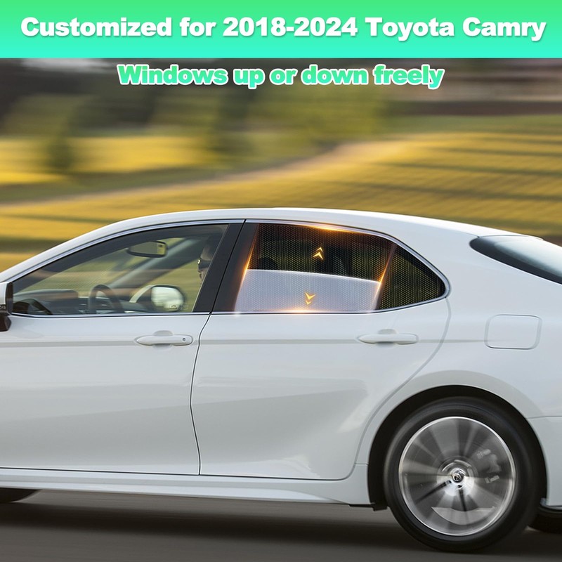 - Perfect Fit for Camry 2018-2024 – Rear Windows Only: Precision-cut to perfectly fit the rear side windows of Toyota Camry models from 2018 to 2024. Offers complete coverage for maximum sun protection and privacy in the backseat. Note: This camry sunshade includes only 2 rear window shades, not suitable for the front windows