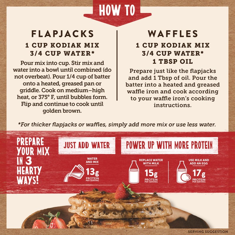 When we heard how many of you add chocolate chips to our flapjack and waffle mixes, we decided to save you all a step by adding them directly to the mix. Kodiak Cakes Chocolate Chip Power Cakes Flapjack and Waffle Mix is packed with 14 grams of high-quality protein and carefully crafted with 100% whole grains, making this frontier-inspired flapjack mix a nutritious breakfast for those activity-filled weekends and big days on the trail. So, make a stack tall enough to share with family or friends, dig in, and know you’ll have the great-tasting nourishment you need to make the most of your day.