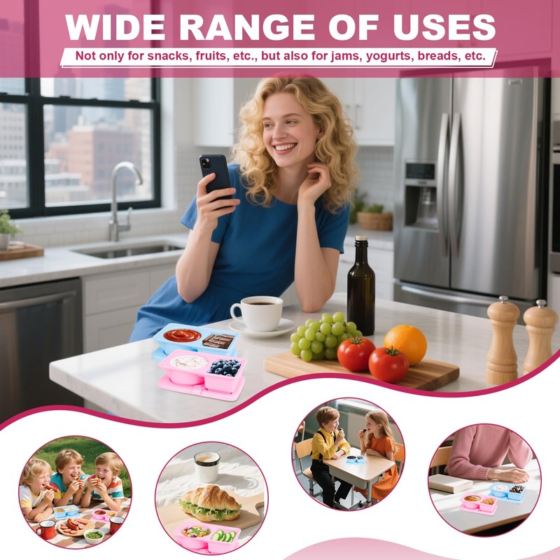 - 【Convenient Design】Silicone containers with secure snap-on lids are spill-proof for messy little hands. compartment snack containers for charcuterie, nuts, or meal prep – a snack solution for all ages!