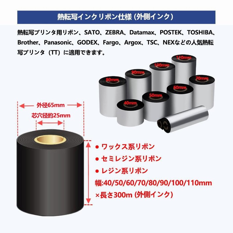 - Product Overview: Heat transfer ribbon for thermal printers, compatible with popular heat transfer printers (TT), such as SATO, ZEBRA, SATO, ZEBRA, TOSHIBA, Panasonic, GODEX, Fargo, Argox, NEX and more. Thermal ribbon for thermal transfer printers, label printers, card printers, and more diversified market needs with extended applications. The ink ribbon can be divided into wax, semi-resin or resin based depending on the composition and composition of the ingredients used. We carry a variety of ink ribbons (thermal transfer ribbon and thermal ribbons) for heat transfer printers, such as label printers, tag printers, card printers, etc. We provide the perfect ribbon for whatever application you need for labels and tags such as wax-based ribbons, resin ribbons and more. Purchase the combination of label base material and ink ribbon for reference
