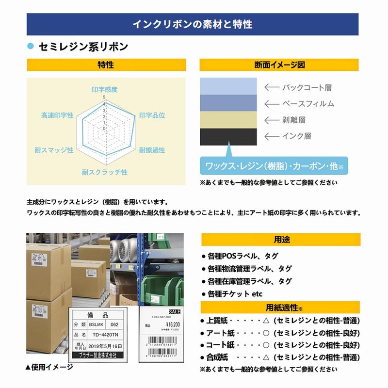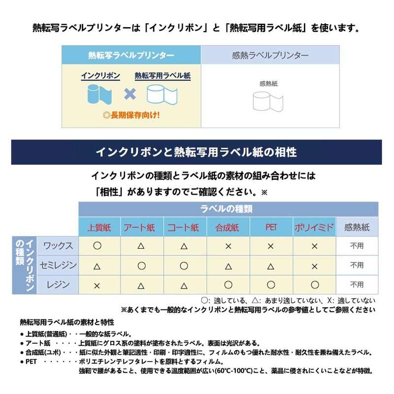 - Resin Ribbon: Features: Resin based on ink composition. Many multi-layered configurations. The resin ribbon is characterized by maximum printability, but is compatible with synthetic paper, film, and is not suitable for non-smooth tags and label paper. It has excellent abrasion resistance, solvent resistance, and heat resistance, and high print resistance. Uses: FA process management label, auto parts management label, medical inspection management label, various cards Paper: Coated paper, various tags paper, synthetic paper, PET labels, various film, etc