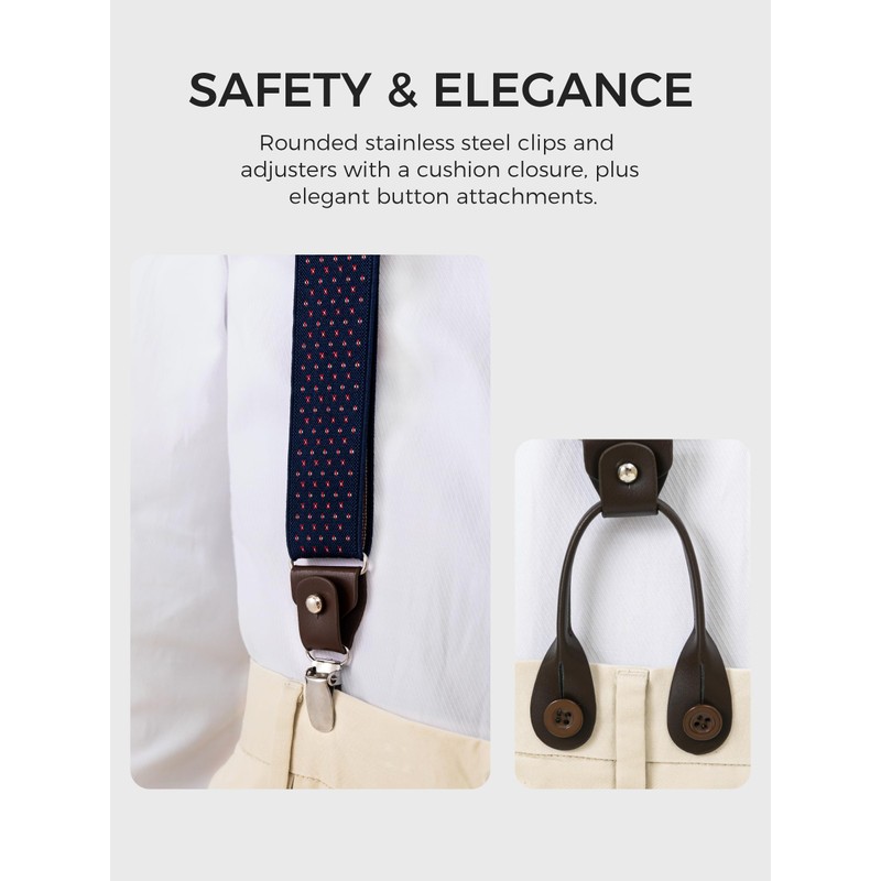 - Outstanding Design: Blending modern casual style with 1950s flair, these suspenders are versatile for both formal and workwear. Featuring a mix of formality, retro, and trendy aesthetics, they offer innovative dual attachment options, allowing you to choose between metal clips or button connectors.