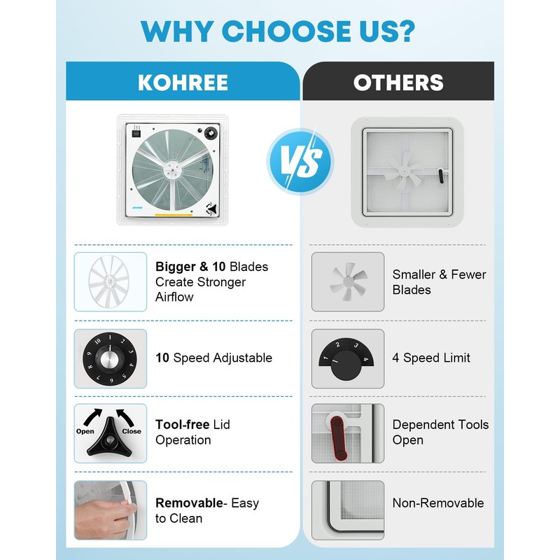 - KEEPS RV COOL: The Kohree RV vent fan with 10 blades can provide powerful airflow at 934CFM (1503.4m3/h), ensuring rapid cooling and fresh air circulation.