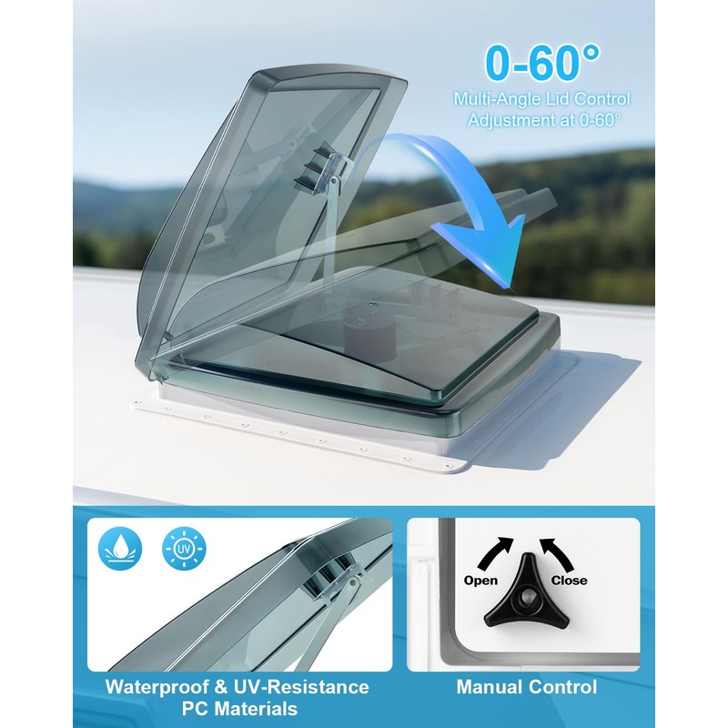 - MANUAL TOOL-FREE LID OPEN: Easily open the rv exhaust fan cover without any additional tools. The cover can be opened between 0 and 60, opening and closing can be stopped and started at any position.