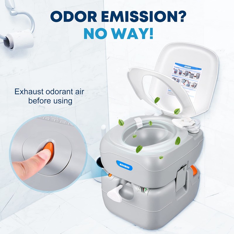 • LARGE CAPACITY WITH LEVEL INDICATOR: Kohree camping toilet owns great storage tank capacity-14.4"(L) x 16.3" (W) x 16.3"(H), with 5.8 gallons (22L) of sewage storage capacity means you'll have to empty it less often and the 3.2-gallon (12L) fresh water capacity allows you to flush about 90 times and each water volume per pump is 0.031gal, it can meet all your outdoor activities needs. Also, the portable toilet for camping is equipped with a waste water tank level indication to let you know when it's time to empty!