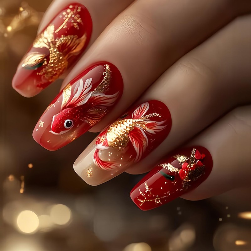 - Fake Nails Design: Our artificial nails use cute koi fish design style, give you fashion unique feeling, pretty and comfortable press on nails will give you good mood and add luster to you