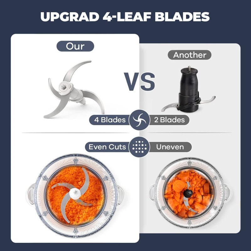 1. This versatile food chopper features a robust pure copper motor and S-shaped bi-level blades, enabling it to chop, blend, puree, mix, and mince efficiently. Each task is completed in about 10 seconds, ensuring quick and even results.