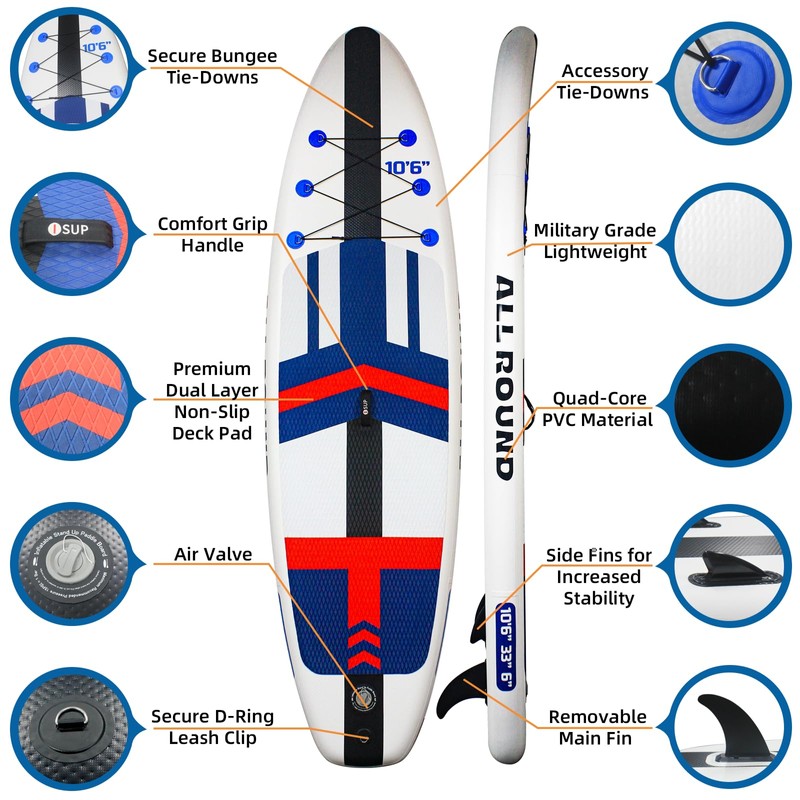 - 【Package Including】This paddle board comes with all essential accessories, including an adjustable aluminum paddle, safety leash, high pressure pump, coil leash, waterproof bag, travel backpack, 3 removable fins and repair kit. The ultra-large backpack makes it easy to carry your paddle board to any destination.