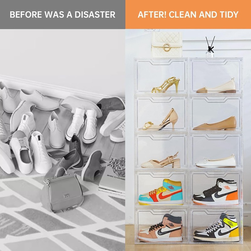- 【Transparent Display and Magnetic Door Design】: Enjoy a 360° transparent display of your sneaker collection, combining stylish elegance with practical organization. The seamless magnetic door ensures smooth, secure closure while allowing instant visibility through the clear side panel—identify your shoes at a glance without opening multiple boxes, saving you time and effort.