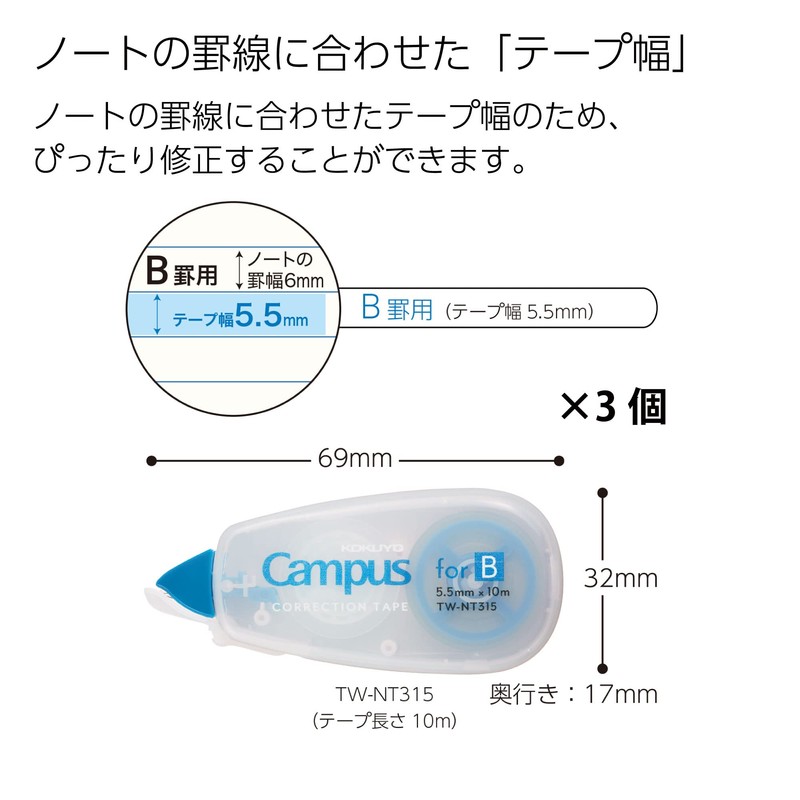 Kokuyo TW-NT315X3 Campus Notebook Correction Tape Disposable B Ruled 5.5mm 10m Blue Pack of 3