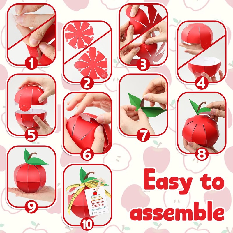 - Quick Assembly: featuring an intuitive design, each red apple container is made from two pieces of coated paper; Simply use a double-sided tape tool to form semicircles, then combine to create the nice gift container; This hassle-free assembly makes it easy to put together a thoughtful gift for your beloved teachers
