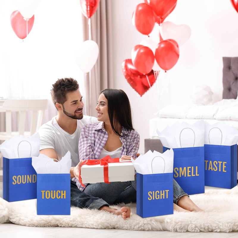 - Innovative Design: you will get 10 pcs white tissue paper and 5 pcs blue 5 senses gift bags embellished with gold words [TASTE], [TOUCH], [SMELL], [SOUND] and [SIGHT] on each bag, these add charm, making your gifting experience memorable
