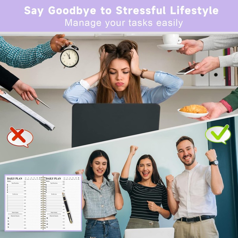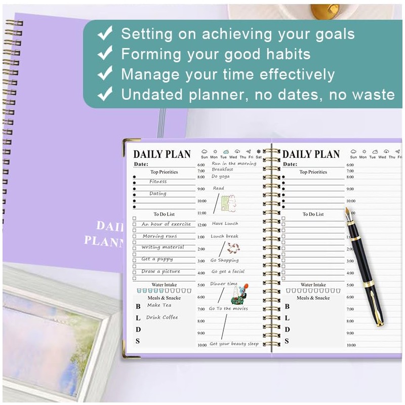 - ✅ Maximize Daily Productivity: This undated daily planner (162 pages) streamlines time management with dedicated sections for hourly schedules (6 AM–10 PM), priority tasks, to-do lists. Its structured layout helps users balance work, personal goals, and health tracking (water/diet logs) while maintaining portability for on-the-go use.
