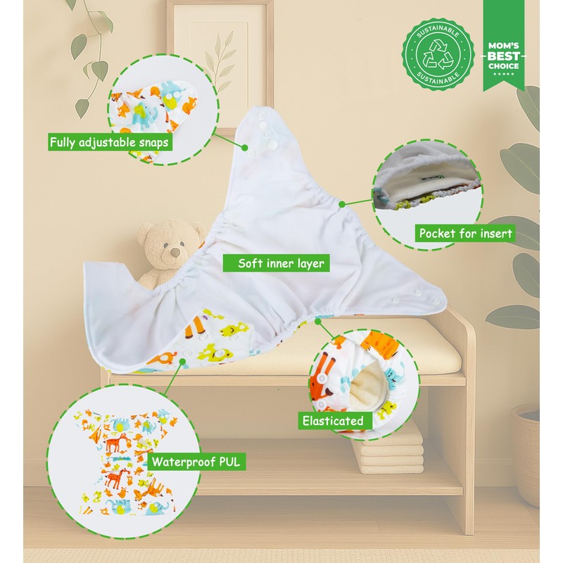 • One size fits all – high comfort for your baby – the nappy set consists of: 6 cloth nappies, 6 bamboo inserts, 1 waterproof nappy bag