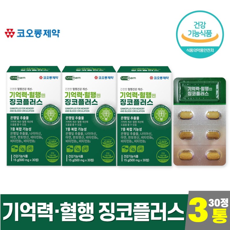 Kolon Pharmaceuticals Memory Blood Circulation Ginkgo Plus 30 tablets 3 boxes Ginkgo Ginkgo Leaf Extract brain health nutritional supplement approved by the Ministry of Food and Drug Safety / 코오롱제약 기억력 혈행 징코플러스 30정 3박스 식약처 식약청 인정 징코 은행잎추출물 두뇌 건강 영양제
