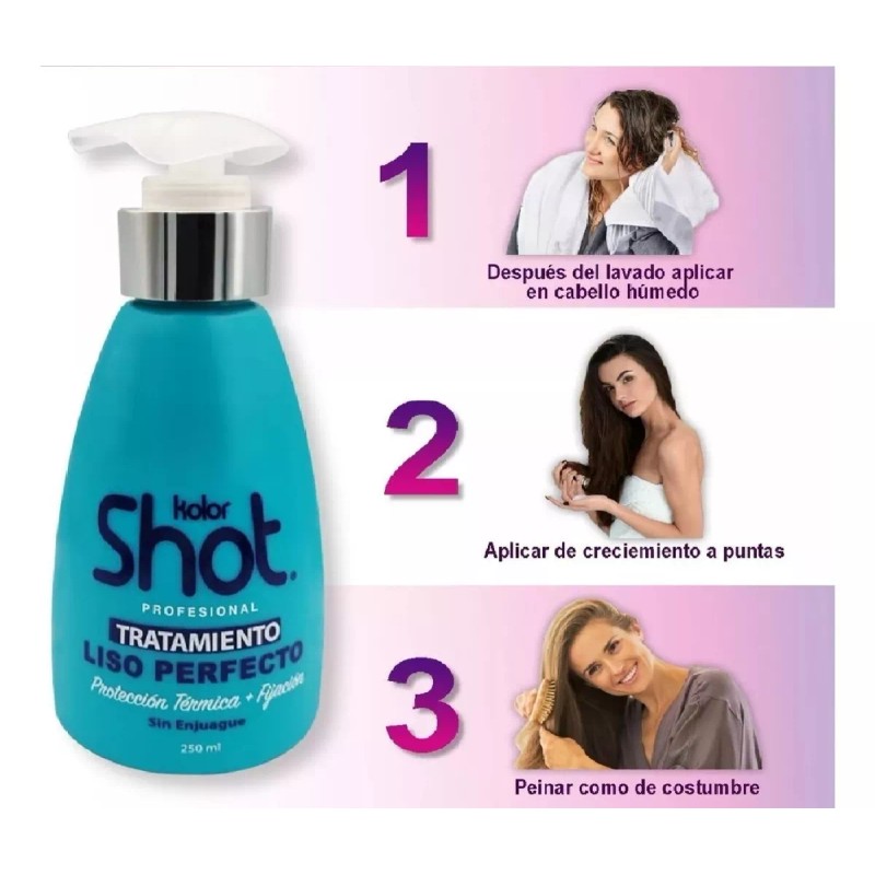 Después del lavado con Shampoo Liso Perfecto Kolor Shot aplicar sobre cabello húmedo de crecimiento a puntas y peinar como de costumbre. Recomendable siempre aplicar en cabello húmedo para mejores resultados.