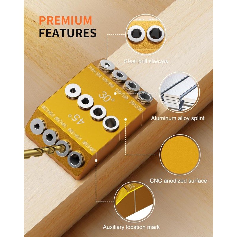 - 【ACCURATE POSITIONING】 There are 3 drilling angle of 30 degree, 45 degree and 90 degree, And four sizes of guide holes for each drilling angle, which are 3/8”(9.52mm), 5/16”(7.93mm), 1/4”(6.35) mm), 3/16"(4.76mm), Our drill guide jig is designed to be your go-to tool for achieving perfect angles every time.