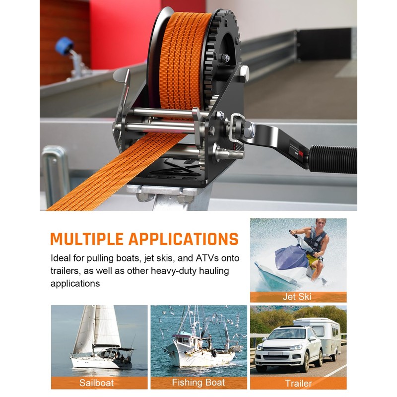 - DURABLE GEAR & POLYESTER STRAP: Built with high-carbon steel gears thickened to 8mm, and a corrosion-resistant galvanized finish, this winch withstands harsh marine environments. The integrated polyester strap resists wear and withstands extreme pressure