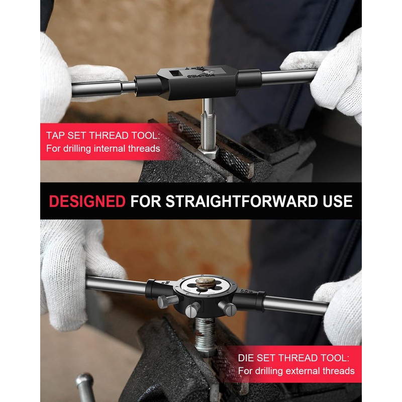 - Enhanced Usability Features: Adjustable tap and die wrenches accommodate various sizes of taps and dies and can be finely tuned for specific applications, ensuring precise results. Center punch and screwdriver ensure accurate thread starts